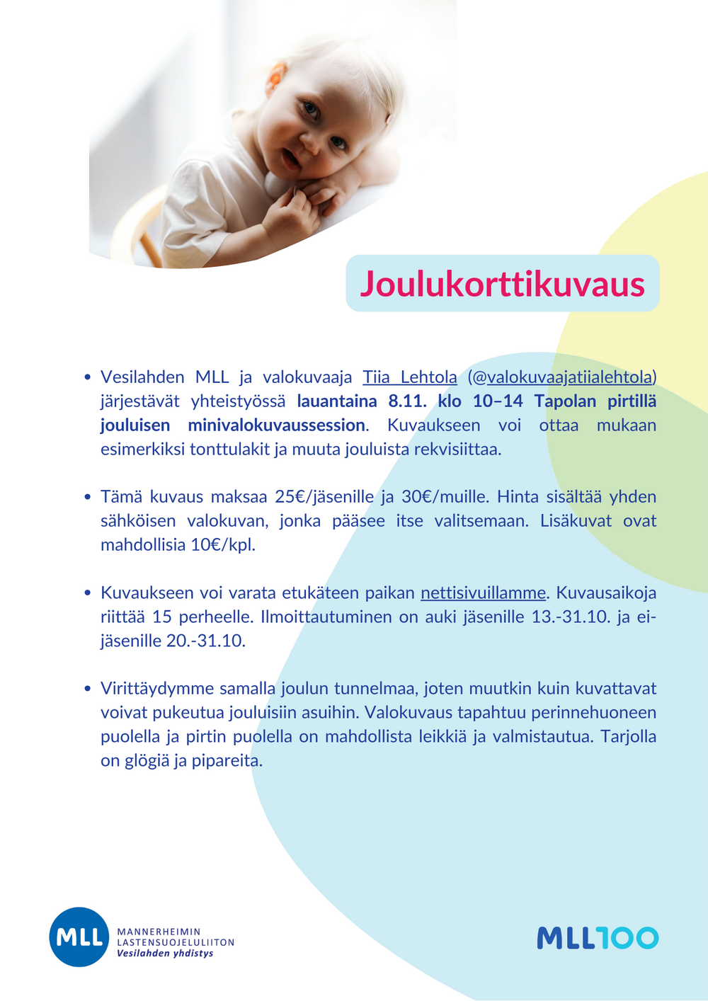 Vesilahden MLL ja valokuvaaja Tiia Lehtola (@valokuvaajatiialehtola) järjestävät yhteistyössä lauantaina 8.11. klo 10–14 Tapolan pirtillä jouluisen minivalokuvaussession. Kuvaukseen voi ottaa mukaan esimerkiksi tonttulakit ja muuta jouluista rekvisiittaa.